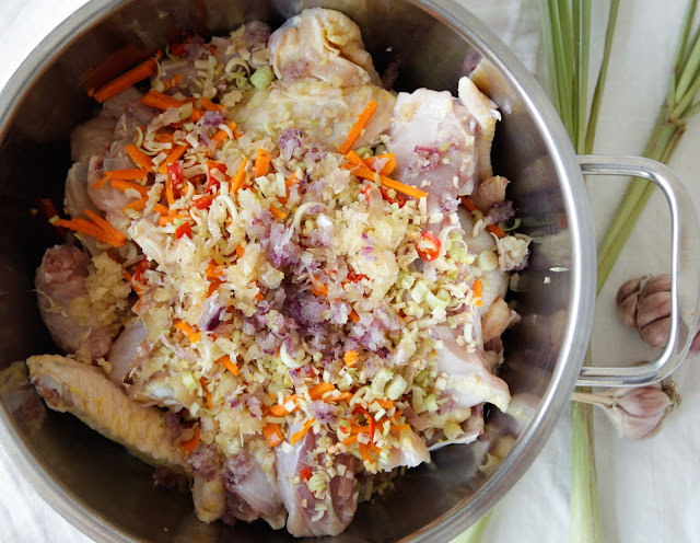 I used a whole chicken bone in cut into small pieces for this recipe as boneless chicken thighs are not readily available over here in Vietnam. We also like to use the whole animal so if you have organ parts, feel free to add them in also. If you choose to use the whole chicken bone in, start by cutting your chicken into 8 pieces (drumstick, thigh, wing, breast separated), then using a cleaver chop into smaller pieces. You can use boneless thigh fillets if preferred.